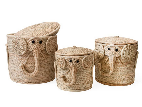Dieses bezaubernde Set aus drei geflochtenen Körben in Elefantenform ist der perfekte Aufbewahrungshelfer für kleine Abenteurer. Die Körbe sind aus natürlichem Material gefertigt und bringen eine gemütliche Atmosphäre in jedes Kinderzimmer. Ideal für Spielzeug, Kuscheltiere und vieles mehr.