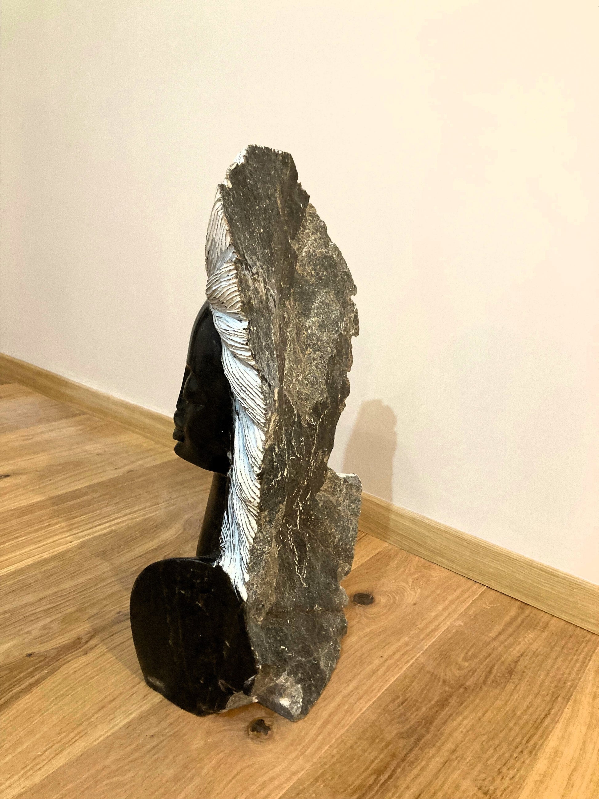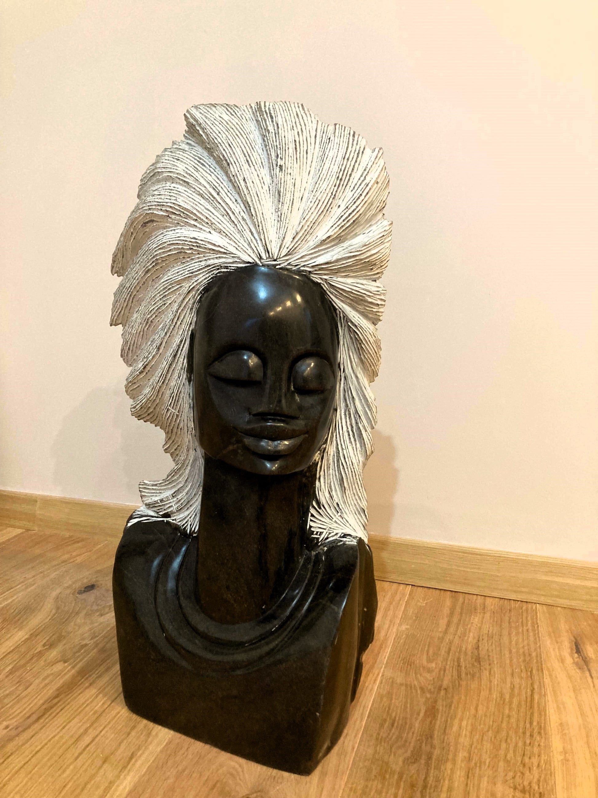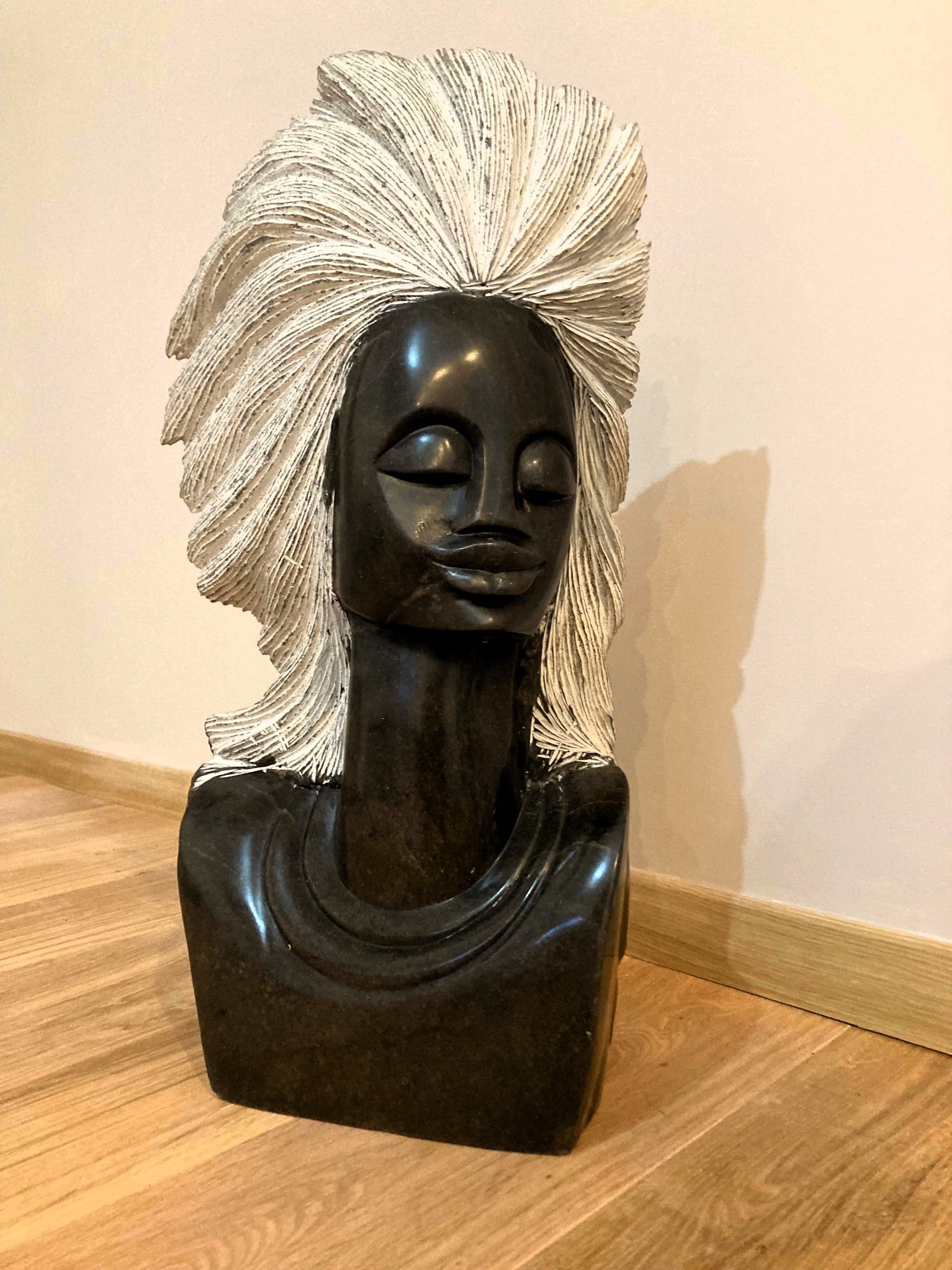 Zeitlose Eleganz in Stein gebannt: Diese faszinierende Skulptur aus schwarzem Serpentine ist eine Hommage an die Schönheit und Stärke der Frau. Das Spiel von Licht und Schatten auf dem polierten Stein lässt die Konturen des Gesichts und die kunstvoll gestalteten Haare aus weißem Material lebendig werden. Ein Meisterwerk zeitgenössischer afrikanischer Kunst, das jeden Raum bereichert.