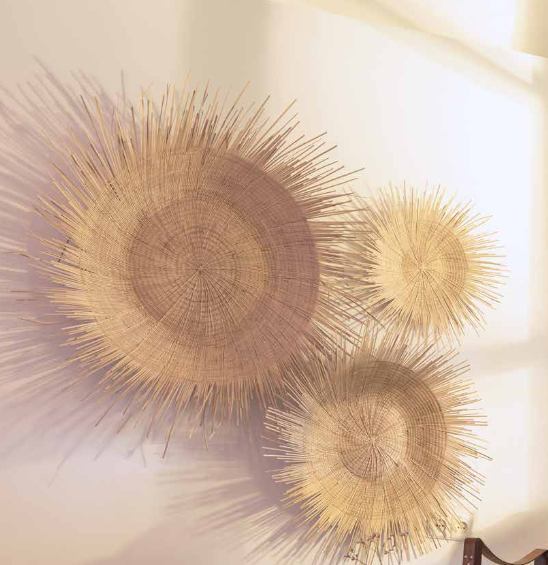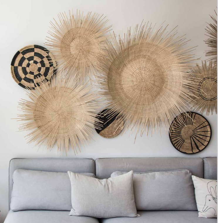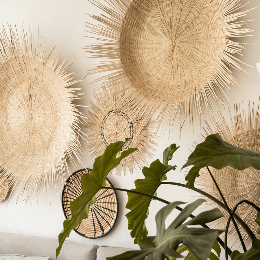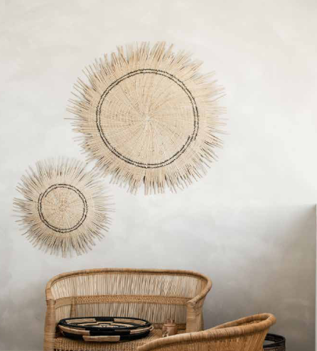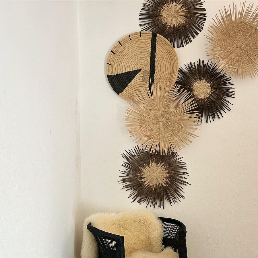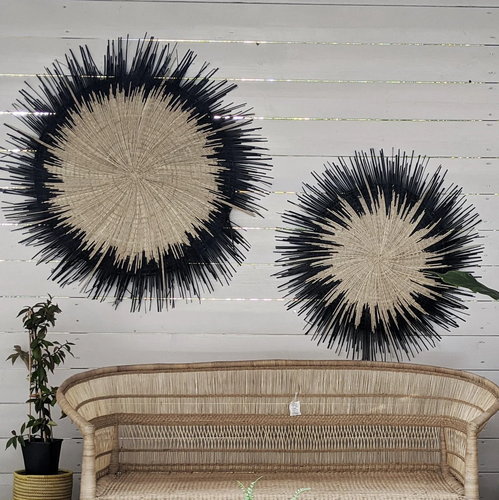 Ikonisches gewebtes Wanddekor aus Malawi, inspiriert von der Sonne. Aufwendig gewebt, erhellen Ihren Raum jeden Tag. Ganz natürlich mit braunem Streifen oder natürlich mit einem kräftigen schwarzen Rand. Jede Sonnenplatte hat eine Aufhängeschlaufe.